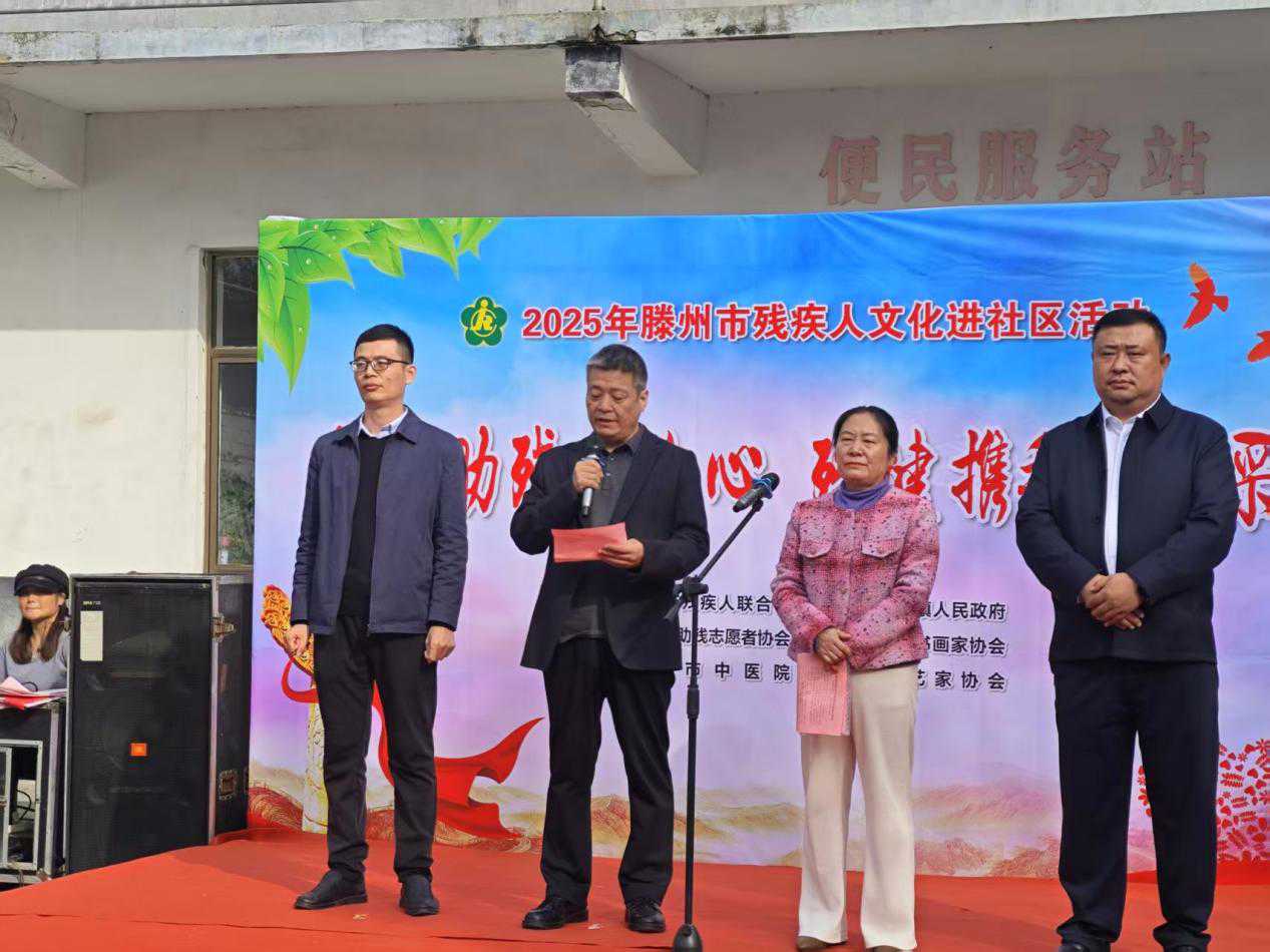 为深入贯彻党的二十届四中全会精神,以高质量文化供给丰富残疾人精神文化生活,推动扶残助残社会风尚,10月30日由滕州市残联联合柴胡店镇人民政府主办的“文化助残暖人心 残健携手展风采”残疾人文化进社区活动,在柴胡店镇前大官庄社区温情启幕。活动由滕州市助残志愿者协会、残疾人书画家协会承办,滕州市中医院、曲艺家协会协办,为残疾人送去文艺表演和健康服务。